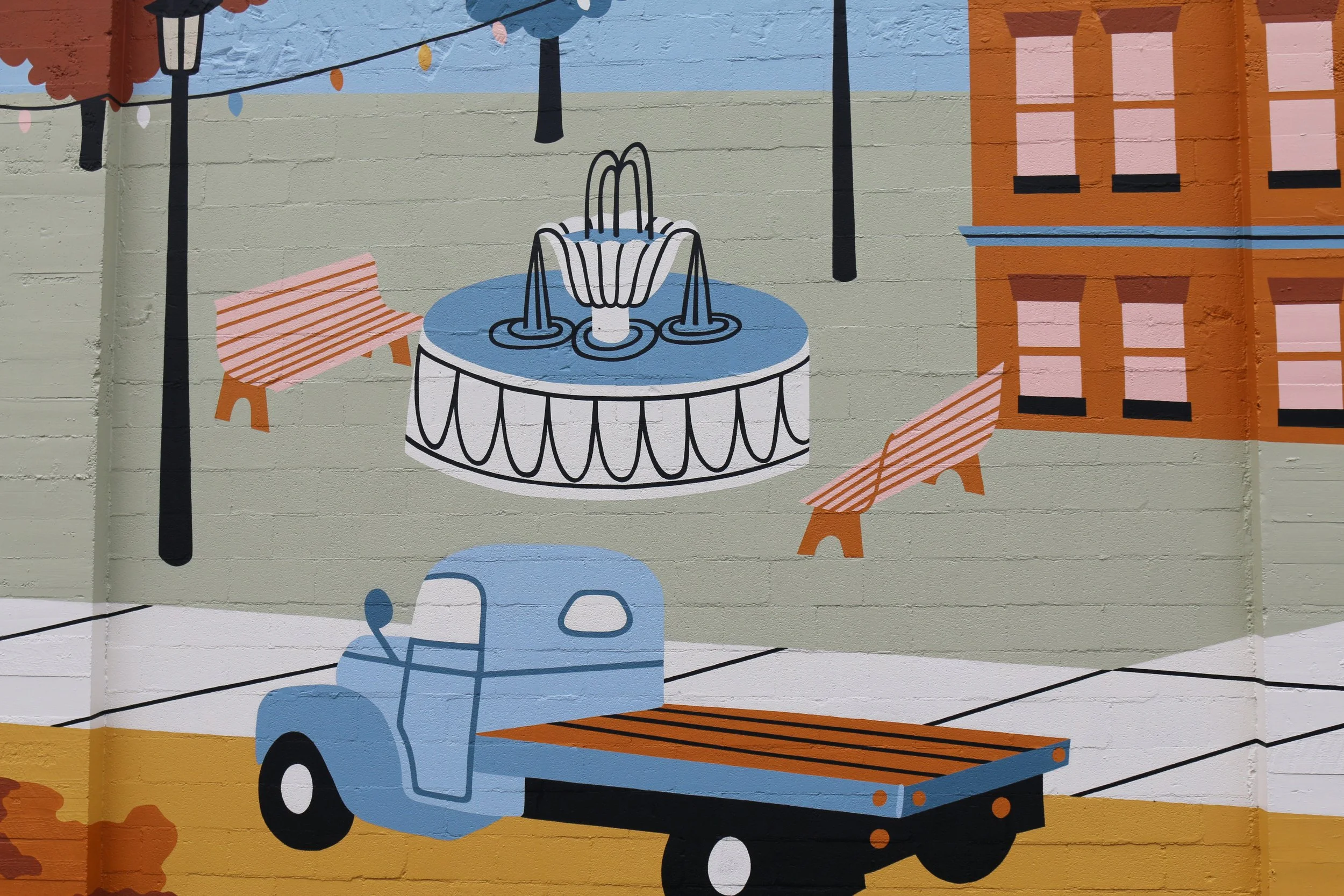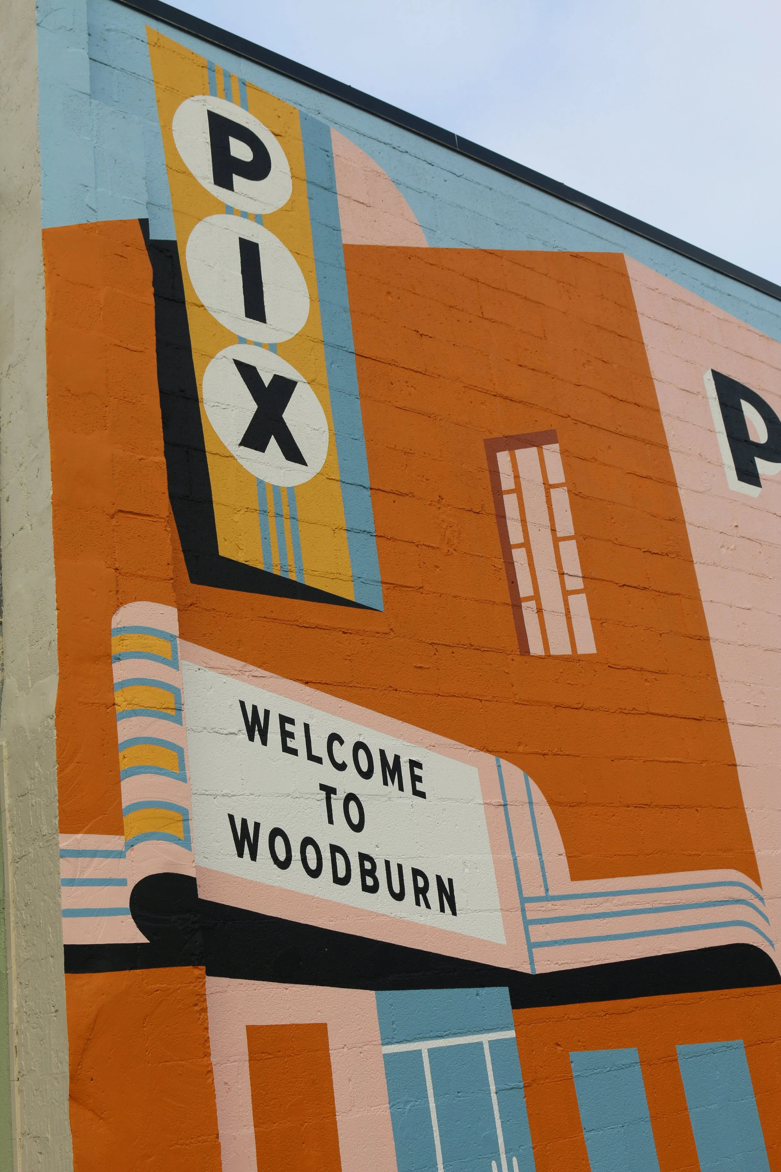 We designed and painted this 100’ x 20’ mural for the City of Woodburn. The historic Pix Theatre was torn down due to neglect and they asked us to paint a mural to commemorate it. We included elements from Woodburn’s past and present including the theatre, the downtown plaza, fountain and city hall building.