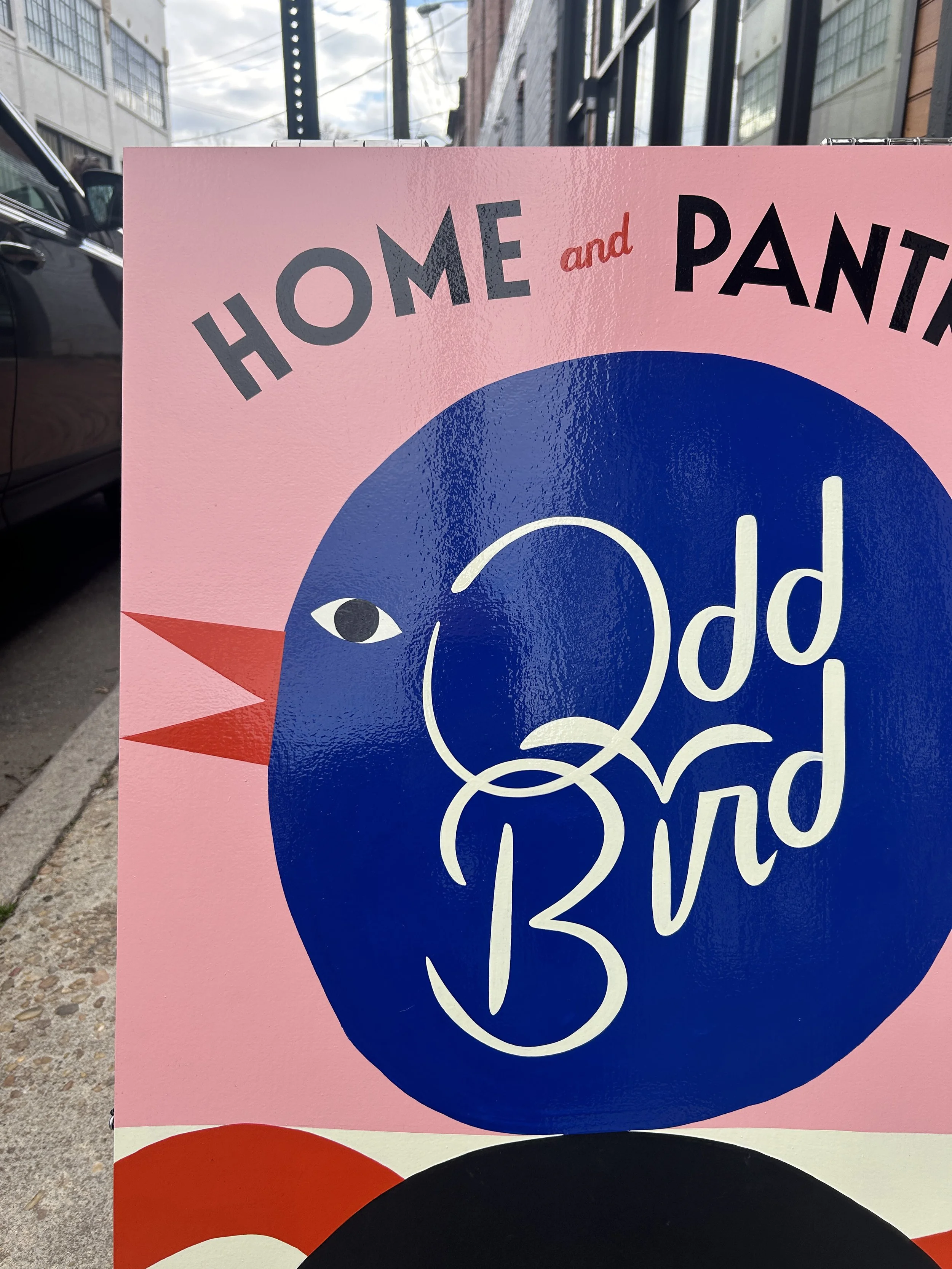 Odd Bird is a quirky and colorful home goods store located in historic Jackson Ward in Richmond, Virginia. We worked with them to design and paint a sandwich board, a custom away sign, and a double-sided open/closed sign. We used their existing logo, but created custom lettering and illustrations that fit their aesthetic. We also designed custom laser cut clock hands for the away sign.
