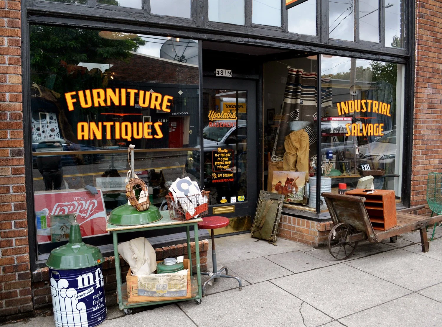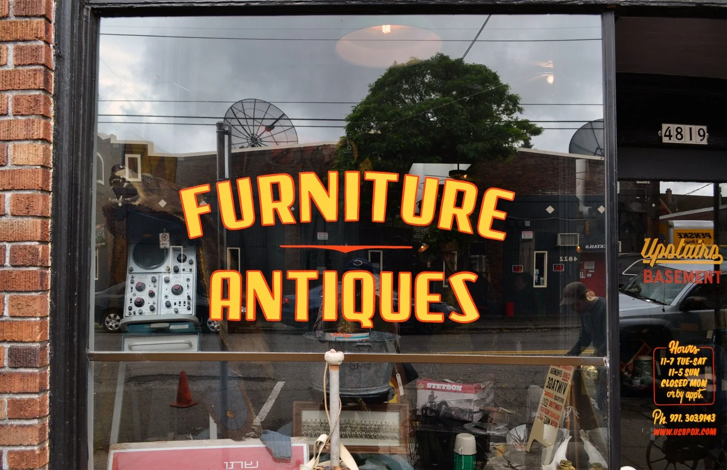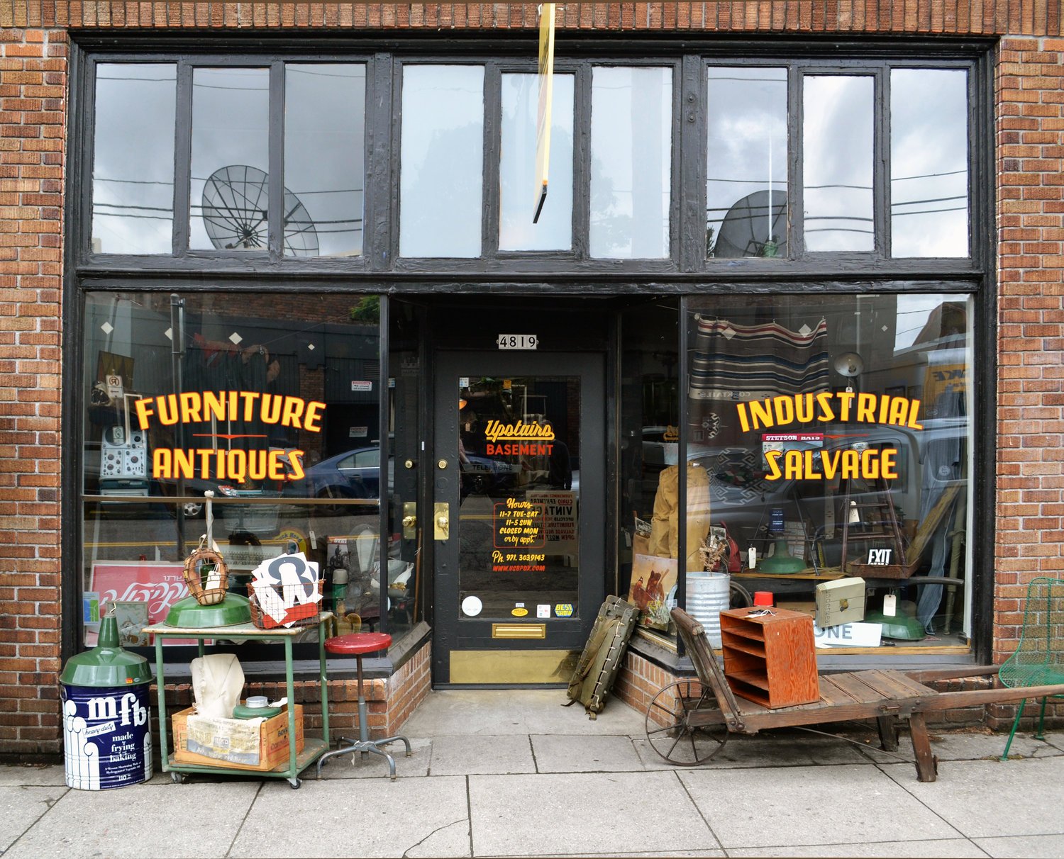 We designed and painted these descriptive words on the front windows of Upstairs Basement. We also painted their logo, information and business hours on their front door.